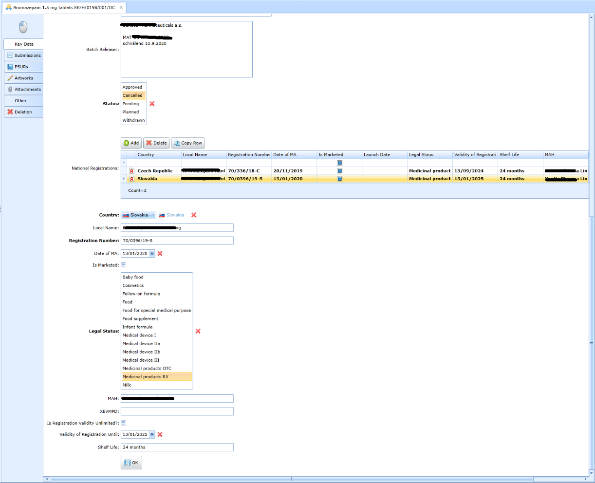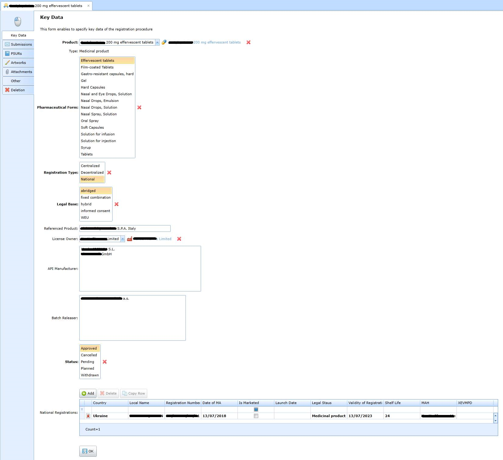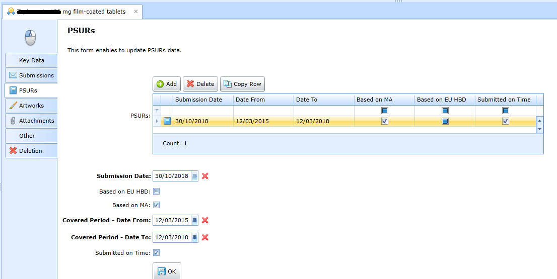 Aplikace umožňuje evidovat údaje týkající se PSUR hlášení ke každému