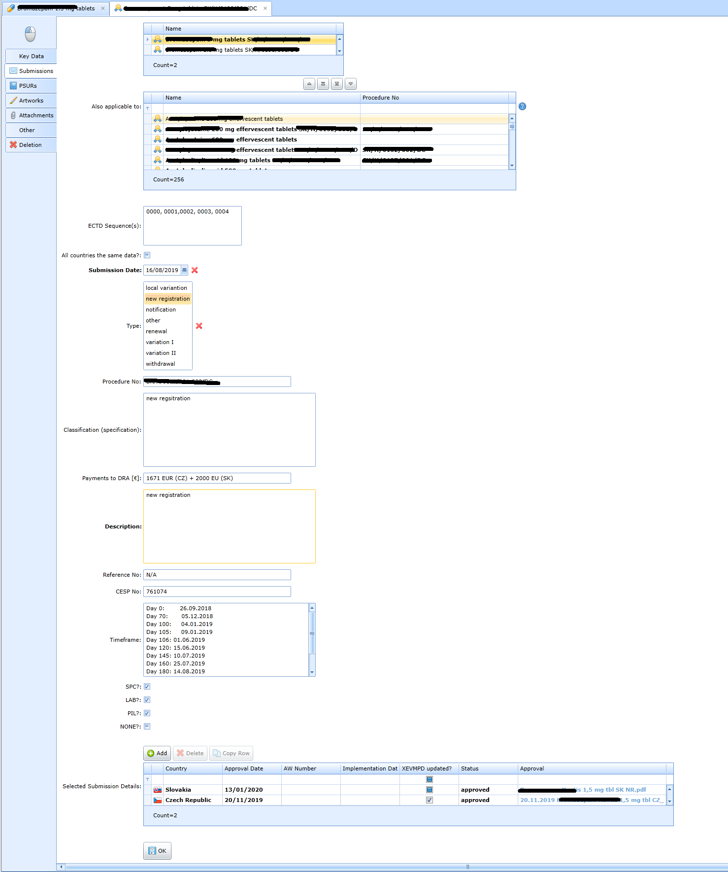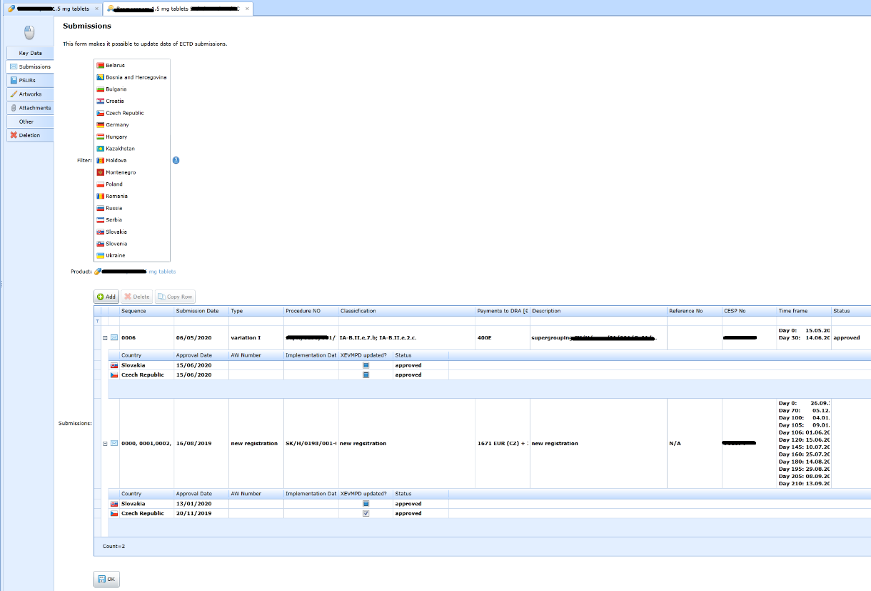 ECTD sekvence odeslané regulační autoritě. V EU se mohou týkat více zemí